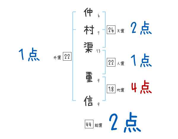 天運![]() | 仲村渠重信さんの天運は26画の2つ星!波瀾万丈かも。信頼できる人を大事にしましょう。 家系が持つ宿命的な運勢を表します。祖先から受け継いだ苗字ですので自分の力が及びません。家柄を象徴します。 |