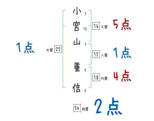 総運![]() | 小宮山重信さんの総運は34画の2つ星!独創性に優れるが、自尊心が強く災難に注意しましょう。 あなたの人生を表す1番重要な運勢です。生涯を通じて影響する総合運となり、主に50歳以降の晩年期に影響を及ぼします。 |