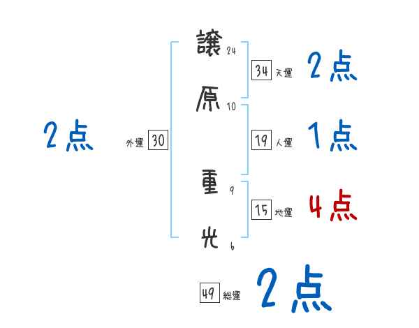 総運![]() | 譲原重光さんの総運は49画の2つ星!不安定な性格で明暗がある人生。周りの人には支援されやすい。 あなたの人生を表す1番重要な運勢です。生涯を通じて影響する総合運となり、主に50歳以降の晩年期に影響を及ぼします。 |