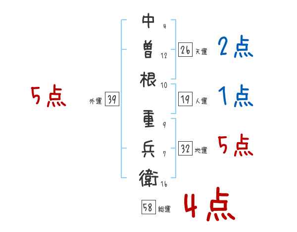 | 外運  | 中曽根重兵衛さんの外運は39画の5つ星!社交性に優れ人望が厚い。人の上に立ち成功する。生活面を象徴する運勢です。外部から受ける影響力を表し、結婚運、家庭運や職場、環境への順応性を表します。 |