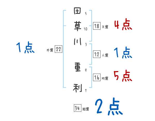 天運![]() | 田草川重利さんの天運は18画の4つ星!情熱的で剛気。忍耐力があり信頼される。 家系が持つ宿命的な運勢を表します。祖先から受け継いだ苗字ですので自分の力が及びません。家柄を象徴します。 |