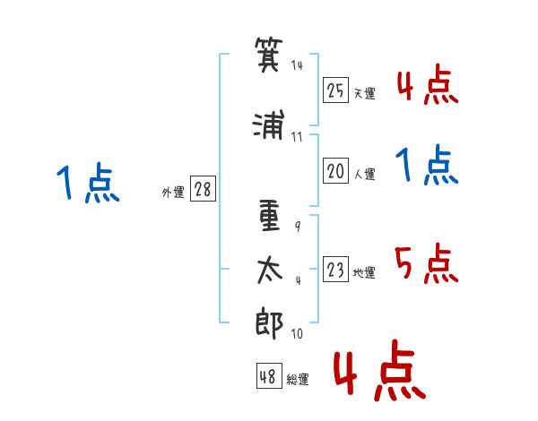天運![]() | 箕浦重太郎さんの天運は25画の4つ星!個性があり才能があふれる。強運の持ち主で発展する。 家系が持つ宿命的な運勢を表します。祖先から受け継いだ苗字ですので自分の力が及びません。家柄を象徴します。 |