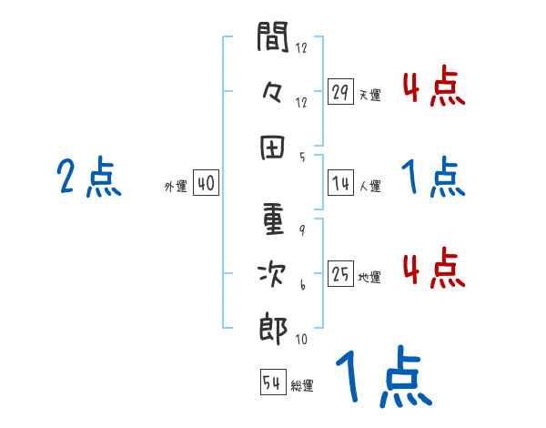 天運![]() | 間々田重次郎さんの天運は29画の4つ星!完全主義で才能がある。厳格な心の持ち主。 家系が持つ宿命的な運勢を表します。祖先から受け継いだ苗字ですので自分の力が及びません。家柄を象徴します。 |
