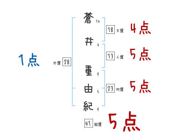 人運![]() | 蒼井重由紀さんの人運は13画の5つ星!才能に恵まれ人気がある。名声を手に入れる。円満な人生。 性格や才能などを表す2番目に重要な運勢です。人間関係や協調性、社会的な成功に影響します。主に20歳から50歳ぐらいまでの中年期の運勢を表します。 |