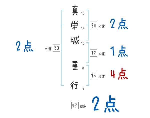 人運![]() | 真栄城重行さんの人運は19画の1つ星!優れた才能を持ちますが、協調性が足りないことも。周りの人と協力する事を意識しましょう。 性格や才能などを表す2番目に重要な運勢です。人間関係や協調性、社会的な成功に影響します。主に20歳から50歳ぐらいまでの中年期の運勢を表します。 |