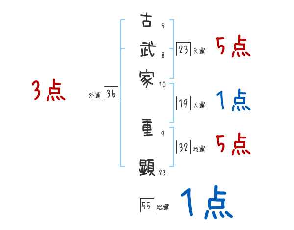 天運![]() | 古武家重顕さんの天運は23画の5つ星!想像力に優れ活力がある。一代で成功し名誉を手に入れる。 家系が持つ宿命的な運勢を表します。祖先から受け継いだ苗字ですので自分の力が及びません。家柄を象徴します。 |