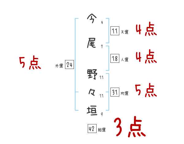外運![]() | 今尾野々垣さんの外運は24画の5つ星!家庭運が良く順調な人生。金運にも恵まれる。 生活面を象徴する運勢です。外部から受ける影響力を表し、結婚運、家庭運や職場、環境への順応性を表します。 |