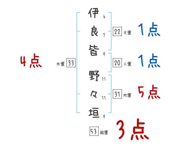 伊良皆野々垣さんの画数の鑑定結果