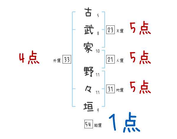 天運![]() | 古武家野々垣さんの天運は23画の5つ星!想像力に優れ活力がある。一代で成功し名誉を手に入れる。 家系が持つ宿命的な運勢を表します。祖先から受け継いだ苗字ですので自分の力が及びません。家柄を象徴します。 |