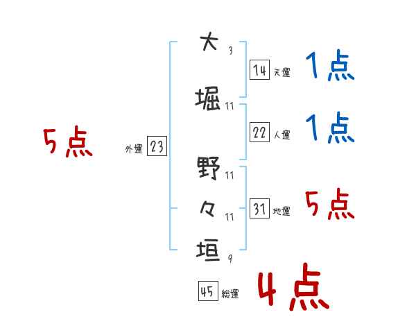 | 外運  | 大堀野々垣さんの外運は23画の5つ星!想像力に優れ活力がある。一代で成功し名誉を手に入れる。生活面を象徴する運勢です。外部から受ける影響力を表し、結婚運、家庭運や職場、環境への順応性を表します。 |