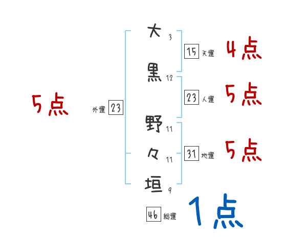 人運![]() | 大黒野々垣さんの人運は23画の5つ星!想像力に優れ活力がある。一代で成功し名誉を手に入れる。 性格や才能などを表す2番目に重要な運勢です。人間関係や協調性、社会的な成功に影響します。主に20歳から50歳ぐらいまでの中年期の運勢を表します。 |