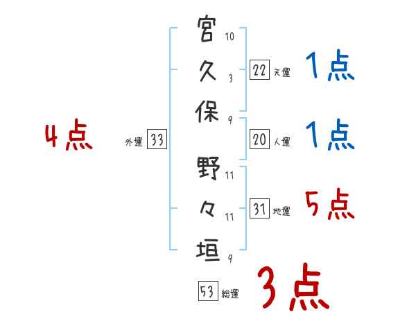 外運![]() | 宮久保野々垣さんの外運は33画の4つ星!権力志向でプライドが高い。勇気があり運を切り開き成功する。 生活面を象徴する運勢です。外部から受ける影響力を表し、結婚運、家庭運や職場、環境への順応性を表します。 |