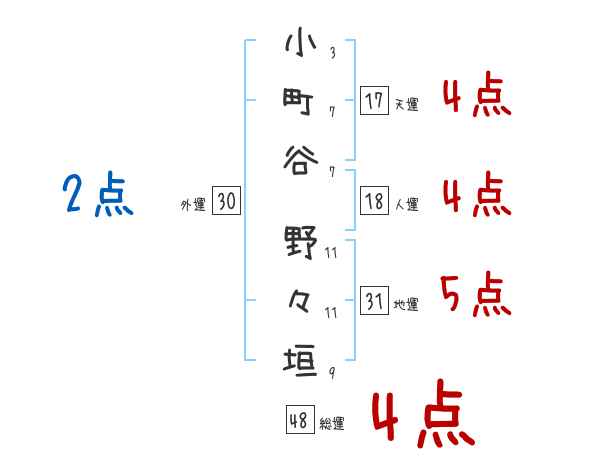 人運![]() | 小町谷野々垣さんの人運は18画の4つ星!情熱的で剛気。忍耐力があり信頼される。 性格や才能などを表す2番目に重要な運勢です。人間関係や協調性、社会的な成功に影響します。主に20歳から50歳ぐらいまでの中年期の運勢を表します。 |