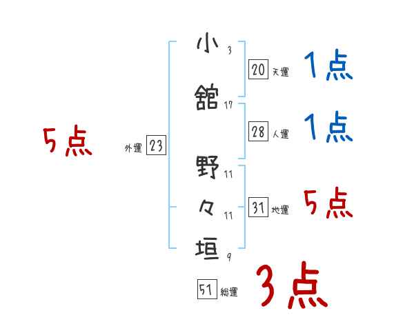 人運![]() | 小舘野々垣さんの人運は28画の1つ星!家庭環境に注意。スポーツで活躍できる能力があるかも。 性格や才能などを表す2番目に重要な運勢です。人間関係や協調性、社会的な成功に影響します。主に20歳から50歳ぐらいまでの中年期の運勢を表します。 |