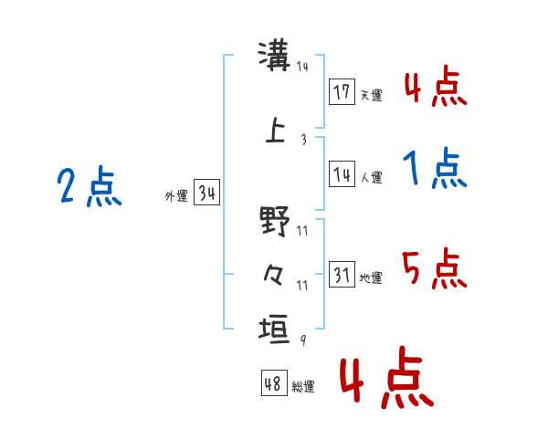 外運![]() | 溝上野々垣さんの外運は34画の2つ星!独創性に優れるが、自尊心が強く災難に注意しましょう。 生活面を象徴する運勢です。外部から受ける影響力を表し、結婚運、家庭運や職場、環境への順応性を表します。 |