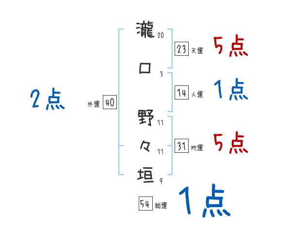 天運![]() | 瀧口野々垣さんの天運は23画の5つ星!想像力に優れ活力がある。一代で成功し名誉を手に入れる。 家系が持つ宿命的な運勢を表します。祖先から受け継いだ苗字ですので自分の力が及びません。家柄を象徴します。 |