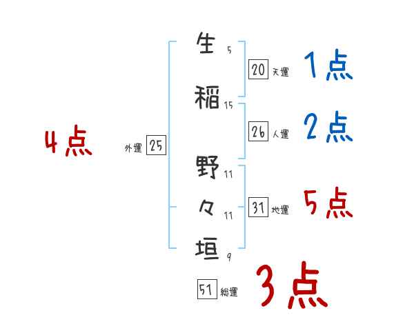総運![]() | 生稲野々垣さんの総運は51画の3つ星!変化が激しく、危険に注意。堅実な性格。 あなたの人生を表す1番重要な運勢です。生涯を通じて影響する総合運となり、主に50歳以降の晩年期に影響を及ぼします。 |