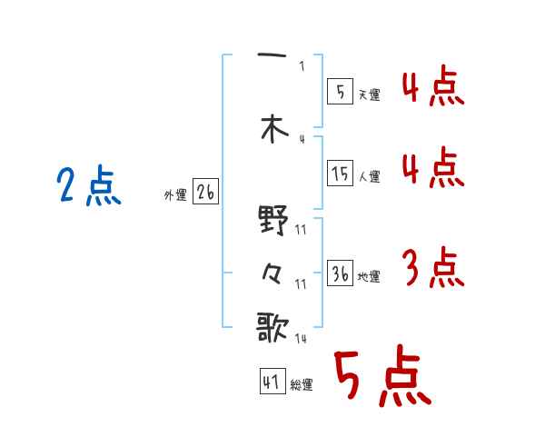 天運![]() | 一木野々歌さんの天運は5画の4つ星!健康で安泰。協調性に優れ、財産に恵まれる。 家系が持つ宿命的な運勢を表します。祖先から受け継いだ苗字ですので自分の力が及びません。家柄を象徴します。 |
