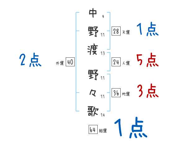 天運![]() | 中野渡野々歌さんの天運は28画の1つ星!家庭環境に注意。スポーツで活躍できる能力があるかも。 家系が持つ宿命的な運勢を表します。祖先から受け継いだ苗字ですので自分の力が及びません。家柄を象徴します。 |