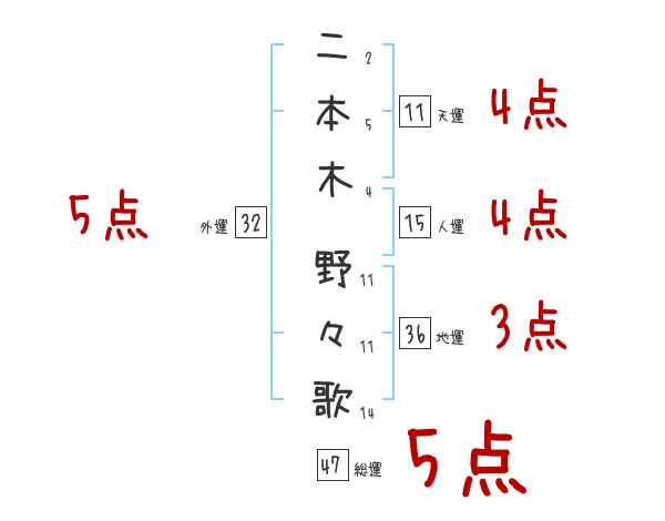 総運![]() | 二本木野々歌さんの総運は47画の5つ星!実力が開花し発展する円満な人生。財に恵まれる。 あなたの人生を表す1番重要な運勢です。生涯を通じて影響する総合運となり、主に50歳以降の晩年期に影響を及ぼします。 |