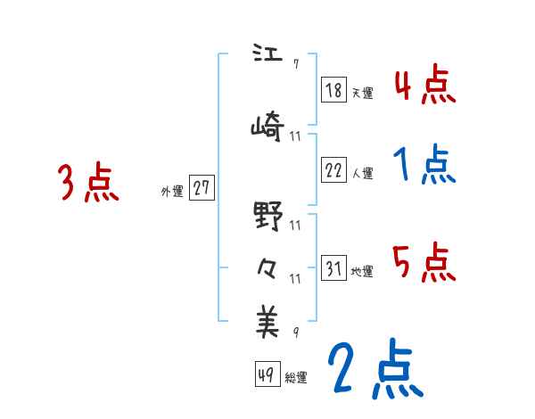 天運![]() | 江崎野々美さんの天運は18画の4つ星!情熱的で剛気。忍耐力があり信頼される。 家系が持つ宿命的な運勢を表します。祖先から受け継いだ苗字ですので自分の力が及びません。家柄を象徴します。 |