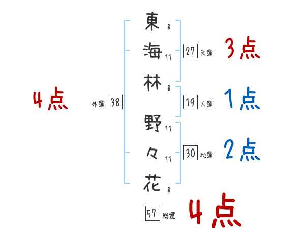 外運![]() | 東海林野々花さんの外運は38画の4つ星!温厚な性格で技術的な才能を発揮する。職人的な仕事に向いている。 生活面を象徴する運勢です。外部から受ける影響力を表し、結婚運、家庭運や職場、環境への順応性を表します。 |