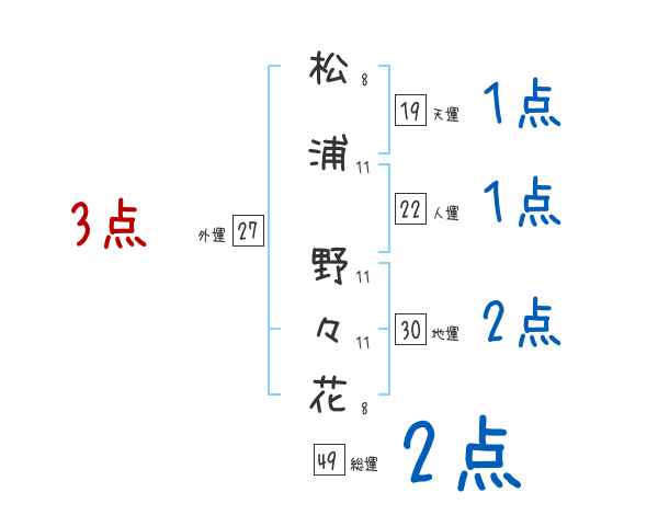 総運![]() | 松浦野々花さんの総運は49画の2つ星!不安定な性格で明暗がある人生。周りの人には支援されやすい。 あなたの人生を表す1番重要な運勢です。生涯を通じて影響する総合運となり、主に50歳以降の晩年期に影響を及ぼします。 |
