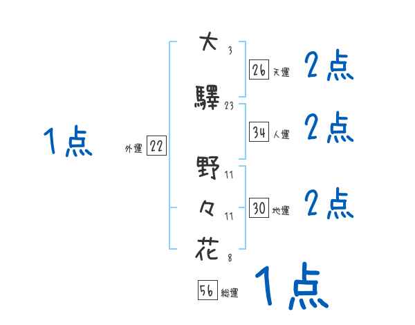 天運![]() | 大驛野々花さんの天運は26画の2つ星!波瀾万丈かも。信頼できる人を大事にしましょう。 家系が持つ宿命的な運勢を表します。祖先から受け継いだ苗字ですので自分の力が及びません。家柄を象徴します。 |