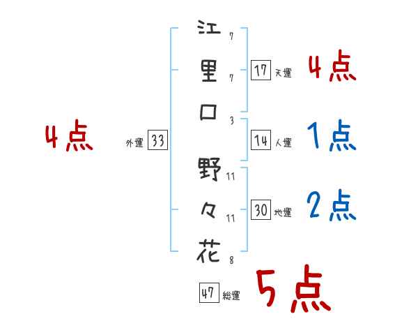 総運![]() | 江里口野々花さんの総運は47画の5つ星!実力が開花し発展する円満な人生。財に恵まれる。 あなたの人生を表す1番重要な運勢です。生涯を通じて影響する総合運となり、主に50歳以降の晩年期に影響を及ぼします。 |
