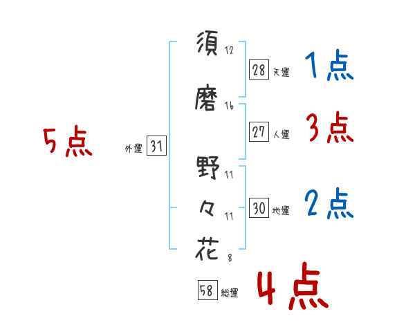 天運![]() | 須磨野々花さんの天運は28画の1つ星!家庭環境に注意。スポーツで活躍できる能力があるかも。 家系が持つ宿命的な運勢を表します。祖先から受け継いだ苗字ですので自分の力が及びません。家柄を象徴します。 |
