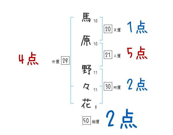 外運![]() | 馬原野々花さんの外運は29画の4つ星!完全主義で才能がある。厳格な心の持ち主。 生活面を象徴する運勢です。外部から受ける影響力を表し、結婚運、家庭運や職場、環境への順応性を表します。 |