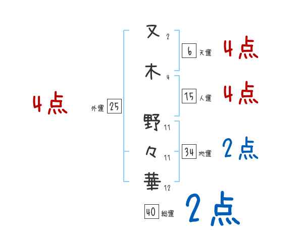 総運![]() | 又木野々華さんの総運は40画の2つ星!自信過剰で物事に固執するためトラブルに注意。 あなたの人生を表す1番重要な運勢です。生涯を通じて影響する総合運となり、主に50歳以降の晩年期に影響を及ぼします。 |