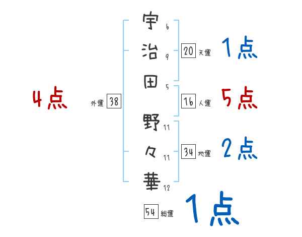 人運![]() | 宇治田野々華さんの人運は16画の5つ星!人望が厚く大きく発展する。逆転成功が見える。 性格や才能などを表す2番目に重要な運勢です。人間関係や協調性、社会的な成功に影響します。主に20歳から50歳ぐらいまでの中年期の運勢を表します。 |