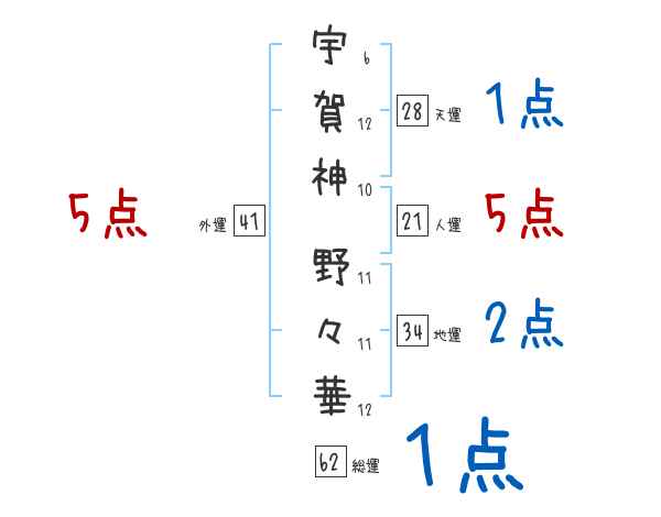 天運![]() | 宇賀神野々華さんの天運は28画の1つ星!家庭環境に注意。スポーツで活躍できる能力があるかも。 家系が持つ宿命的な運勢を表します。祖先から受け継いだ苗字ですので自分の力が及びません。家柄を象徴します。 |
