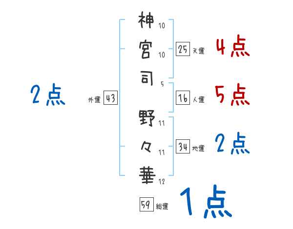 天運![]() | 神宮司野々華さんの天運は25画の4つ星!個性があり才能があふれる。強運の持ち主で発展する。 家系が持つ宿命的な運勢を表します。祖先から受け継いだ苗字ですので自分の力が及びません。家柄を象徴します。 |