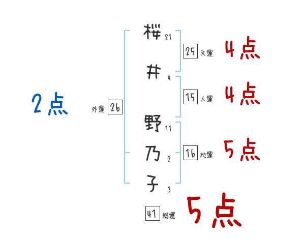 天運![]() | 桜井野乃子さんの天運は25画の4つ星!個性があり才能があふれる。強運の持ち主で発展する。 家系が持つ宿命的な運勢を表します。祖先から受け継いだ苗字ですので自分の力が及びません。家柄を象徴します。 |