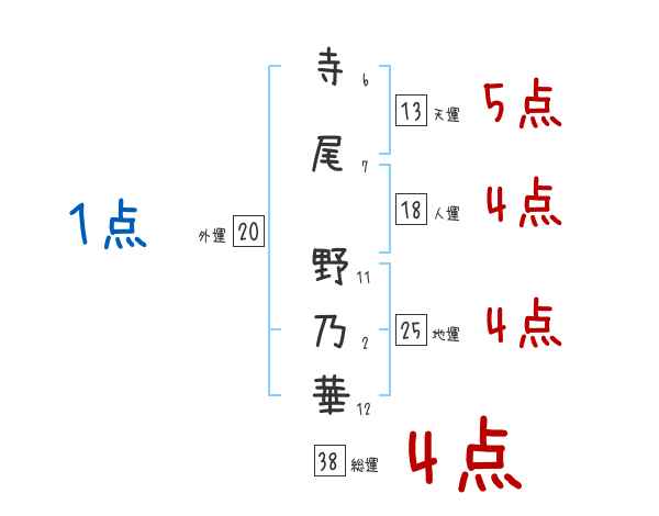 天運![]() | 寺尾野乃華さんの天運は13画の5つ星!才能に恵まれ人気がある。名声を手に入れる。円満な人生。 家系が持つ宿命的な運勢を表します。祖先から受け継いだ苗字ですので自分の力が及びません。家柄を象徴します。 |