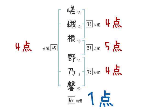 天運![]() | 嵯峨根野乃馨さんの天運は33画の4つ星!権力志向でプライドが高い。勇気があり運を切り開き成功する。 家系が持つ宿命的な運勢を表します。祖先から受け継いだ苗字ですので自分の力が及びません。家柄を象徴します。 |