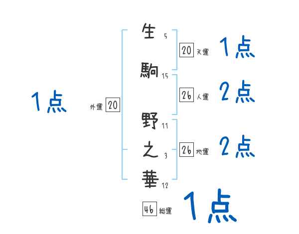 総運![]() | 生駒野之華さんの総運は46画の1つ星!迷走することが多く苦労するかも。目先のことにとらわれないように。 あなたの人生を表す1番重要な運勢です。生涯を通じて影響する総合運となり、主に50歳以降の晩年期に影響を及ぼします。 |