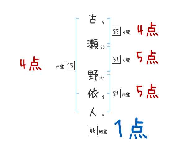天運![]() | 古瀬野依人さんの天運は25画の4つ星!個性があり才能があふれる。強運の持ち主で発展する。 家系が持つ宿命的な運勢を表します。祖先から受け継いだ苗字ですので自分の力が及びません。家柄を象徴します。 |
