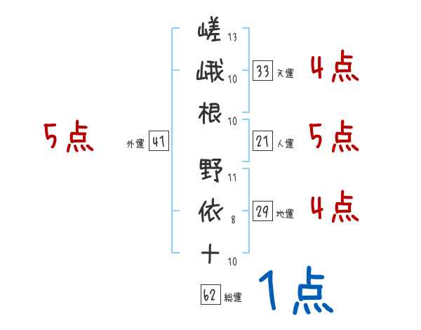 人運![]() | 嵯峨根野依十さんの人運は21画の5つ星!統率力がある。独立し成功する。名誉を手に入れる。 性格や才能などを表す2番目に重要な運勢です。人間関係や協調性、社会的な成功に影響します。主に20歳から50歳ぐらいまでの中年期の運勢を表します。 |