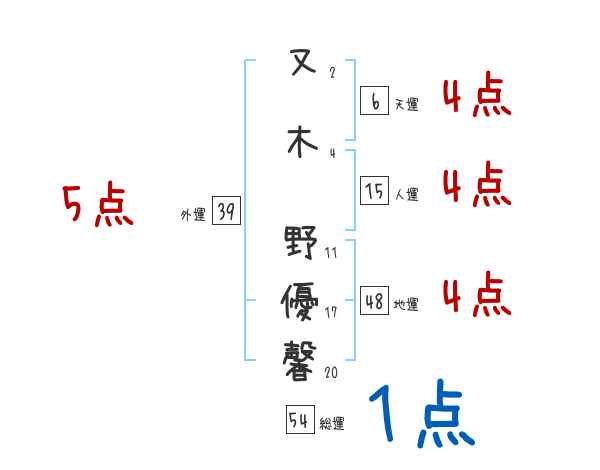 外運![]() | 又木野優馨さんの外運は39画の5つ星!社交性に優れ人望が厚い。人の上に立ち成功する。 生活面を象徴する運勢です。外部から受ける影響力を表し、結婚運、家庭運や職場、環境への順応性を表します。 |