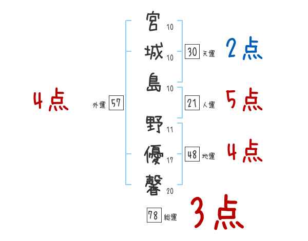 天運![]() | 宮城島野優馨さんの天運は30画の2つ星!浮き沈みの激しさに注意しましょう。 家系が持つ宿命的な運勢を表します。祖先から受け継いだ苗字ですので自分の力が及びません。家柄を象徴します。 |