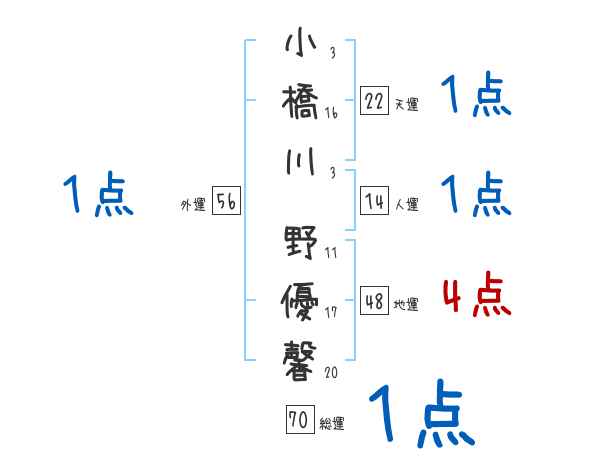 外運![]() | 小橋川野優馨さんの外運は56画の1つ星!消極的で無気力になりがち。誠実な気持ちが必要でしょう。 生活面を象徴する運勢です。外部から受ける影響力を表し、結婚運、家庭運や職場、環境への順応性を表します。 |