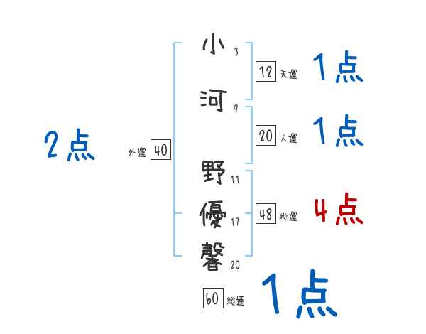 天運![]() | 小河野優馨さんの天運は12画の1つ星!簡単な失敗で諦めてしまいやすいかも。着実に行動すると良いでしょう。 家系が持つ宿命的な運勢を表します。祖先から受け継いだ苗字ですので自分の力が及びません。家柄を象徴します。 |