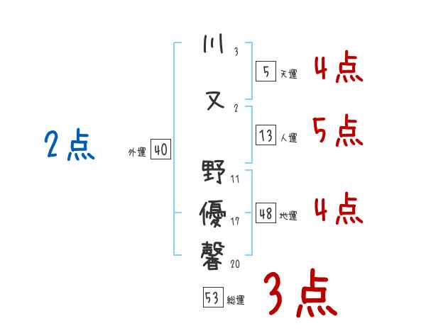 | 天運  | 川又野優馨さんの天運は5画の4つ星!健康で安泰。協調性に優れ、財産に恵まれる。家系が持つ宿命的な運勢を表します。祖先から受け継いだ苗字ですので自分の力が及びません。家柄を象徴します。 |