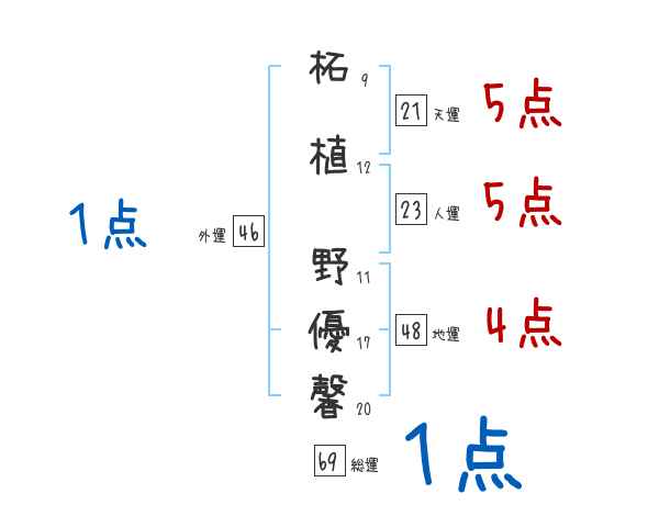 | 総運  | 柘植野優馨さんの総運は69画の1つ星!不満を感じやすい傾向が。ストレスを貯めないように注意しましょう。あなたの人生を表す1番重要な運勢です。生涯を通じて影響する総合運となり、主に50歳以降の晩年期に影響を及ぼします。 |