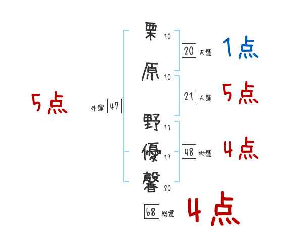 外運![]() | 栗原野優馨さんの外運は47画の5つ星!実力が開花し発展する円満な人生。財に恵まれる。 生活面を象徴する運勢です。外部から受ける影響力を表し、結婚運、家庭運や職場、環境への順応性を表します。 |