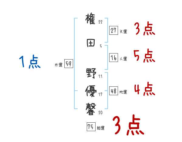 天運![]() | 権田野優馨さんの天運は27画の3つ星!頭脳明晰だが強情で摩擦が多い傾向。孤立に注意。 家系が持つ宿命的な運勢を表します。祖先から受け継いだ苗字ですので自分の力が及びません。家柄を象徴します。 |