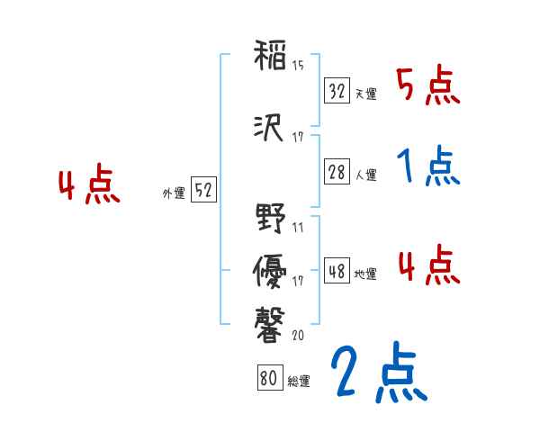 天運![]() | 稲沢野優馨さんの天運は32画の5つ星!柔軟性があり成功する。チャンスが多く金運が良い。 家系が持つ宿命的な運勢を表します。祖先から受け継いだ苗字ですので自分の力が及びません。家柄を象徴します。 |